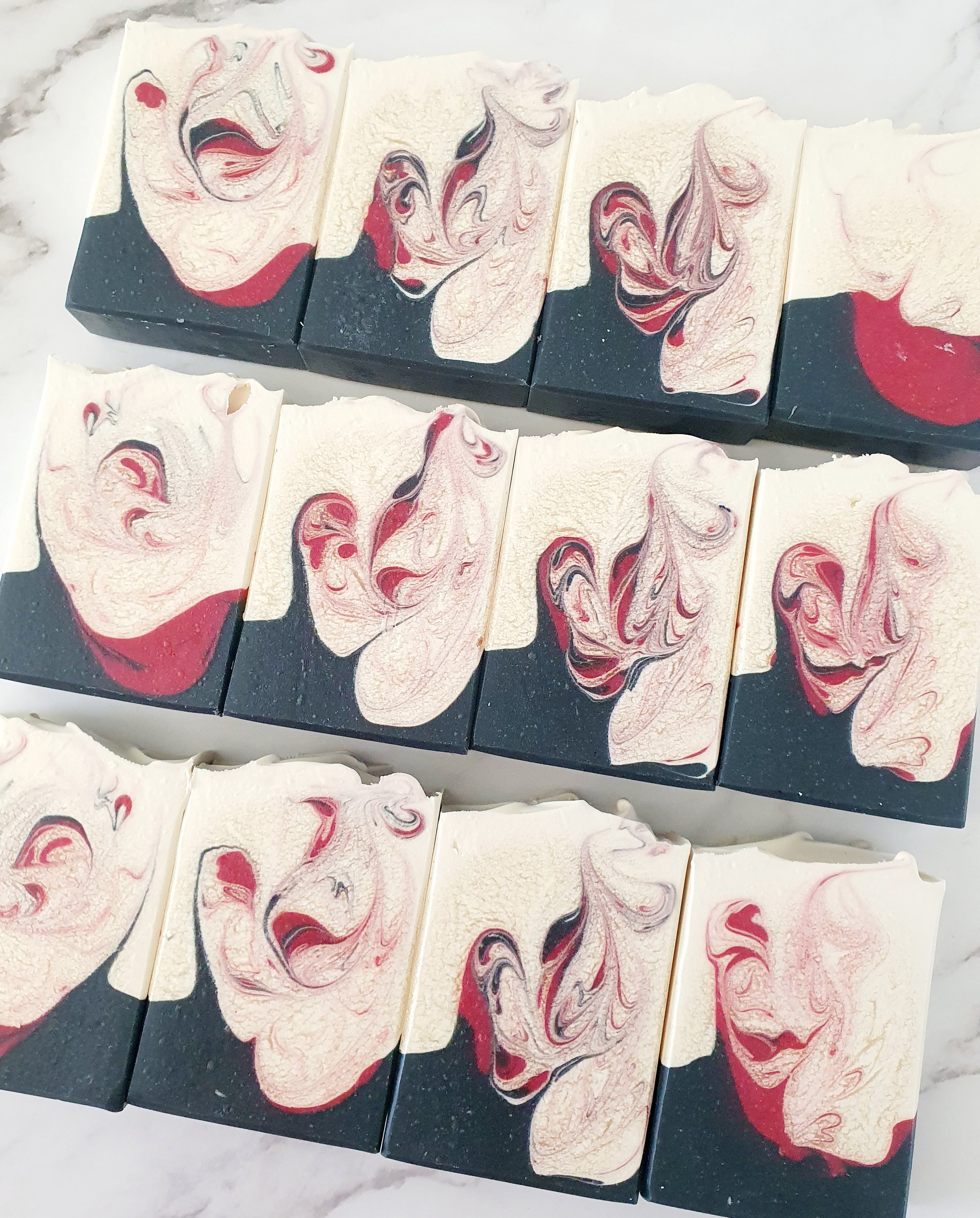 Ingredients: olive oil, coconut oil, water, rice bran oil, sodium hydroxide, shea butter, cocoa butter, castor oil, fragrance oil, titanium dioxide, cosmetic mica.