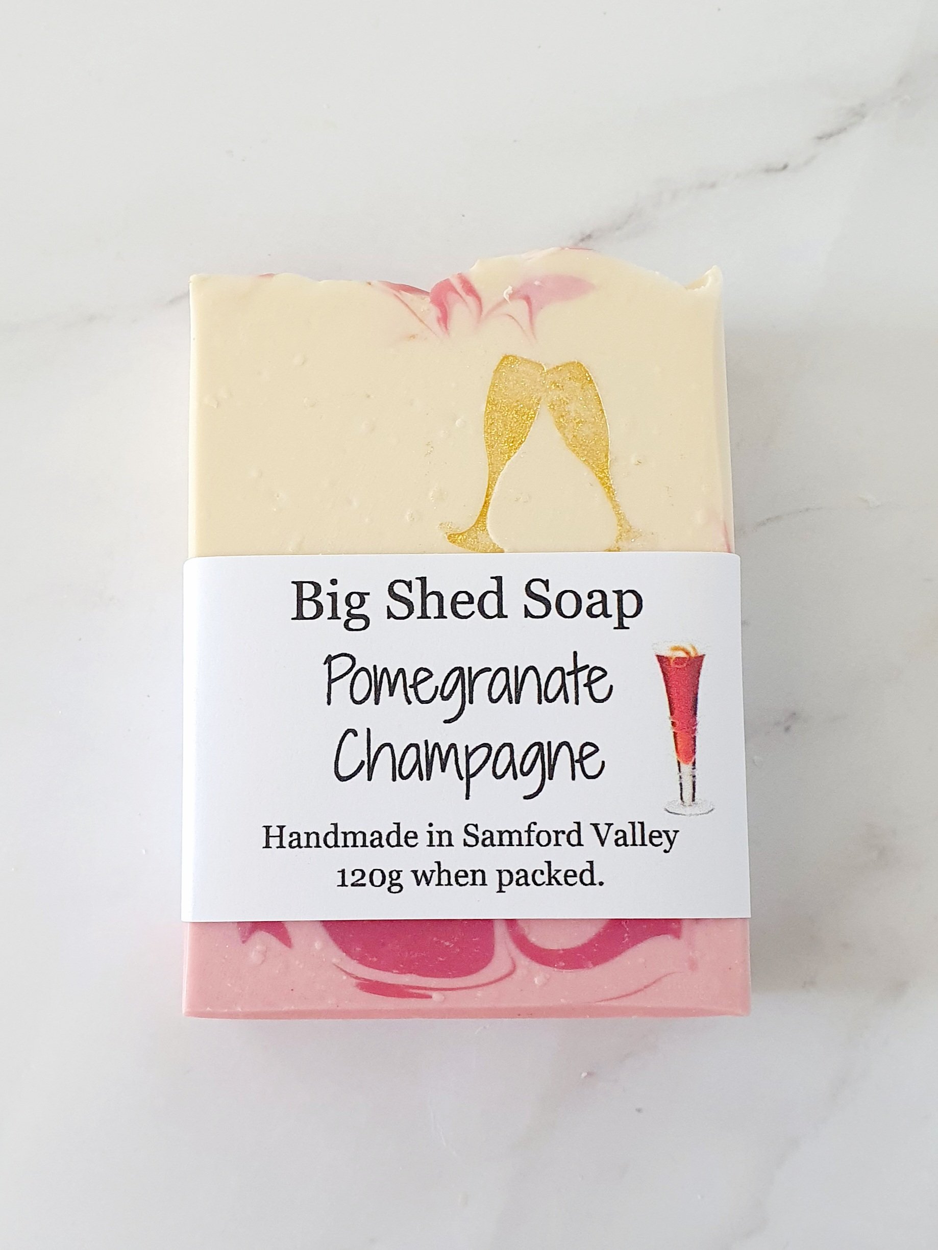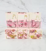 Ingredients: olive oil, coconut oil, water, rice bran oil, shea butter, sodium hydroxide, cocoa butter, castor oil, fragrance oil, cosmetic mica, titanium dioxide.