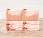 A delicate rose soap, soflty scented with a blend of essential oils including rose geranium and lavender. Coloured with rhubarb root powder and Australian pink clay,.